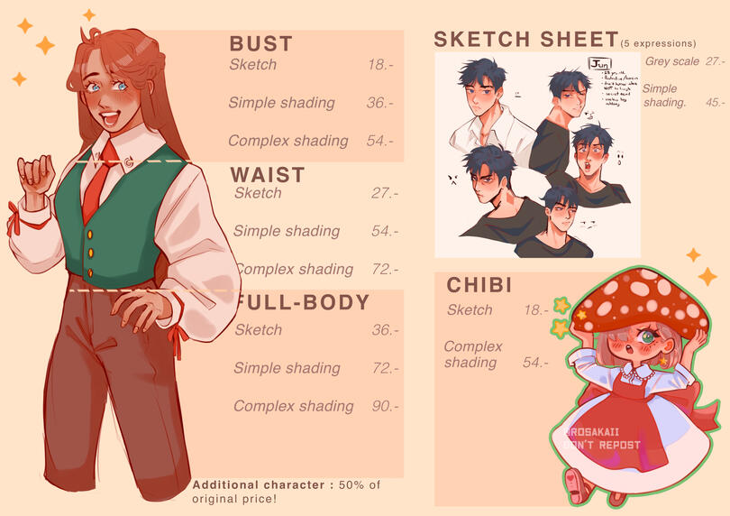 - Expect 2 weeks - 2 months for completion, based on the complexity of your order.- I may work on your commission while live on twitter, please say so if you do not wish for me to do so- Complex orders may add a fee depending on what is asked